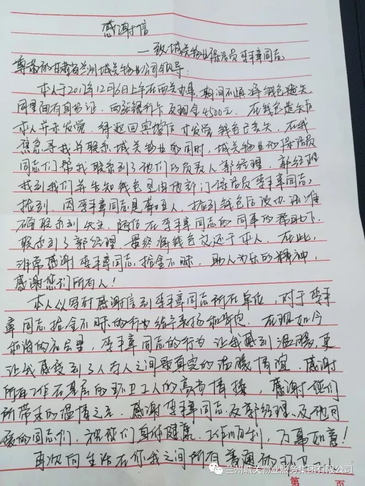 “在現(xiàn)如今和諧的社會(huì)里,李平章同志的行為讓我感到溫暖,更讓我感到了人與人之間最真實(shí)的溫暖情誼。感謝所有工作在基層的環(huán)衛(wèi)工人的高尚情操!”這是失主王先生在給城關(guān)物業(yè)張掖路項(xiàng)目部寫(xiě)來(lái)的感謝信中的一段話。