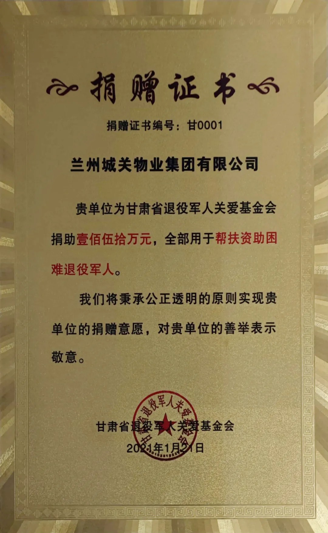 蘭州城關物業(yè)服務集團有限公司積極支持國防和軍隊建設,襄助退役軍人扶危濟困事業(yè),向甘肅省退役軍人關愛基金捐助150萬元善款,以實際行動為幫助退役軍人就業(yè)、解決退役軍人生產(chǎn)生活困難、加強軍政軍民團結(jié)工作貢獻力量、“錦上添花”。