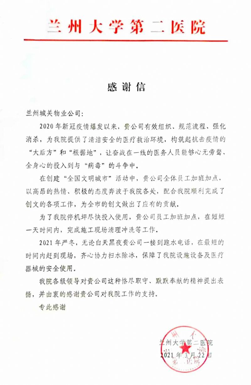 蘭州大學(xué)第二醫(yī)院后勤保障處劉處長(zhǎng)一行人專程來(lái)到蘭州城關(guān)物業(yè)服務(wù)集團(tuán)有限公司,將一面寫(xiě)有“物業(yè)好管家 業(yè)主貼心人”的錦旗贈(zèng)予蘭州城關(guān)物業(yè)服務(wù)集團(tuán)有限公司總裁楊佳林手中,以此表達(dá)對(duì)于城關(guān)物業(yè)的感謝和認(rèn)可。劉處長(zhǎng)表示,2020年新冠疫情爆發(fā)以來(lái),城關(guān)物業(yè)有效組織,規(guī)范流程,為醫(yī)院提供了清潔、安全的醫(yī)療救治環(huán)境,與醫(yī)院一起構(gòu)筑起抗擊疫情的“根據(jù)地”。城關(guān)物業(yè)加班加點(diǎn)保障醫(yī)院后勤的同時(shí),積極配合醫(yī)院順利完成各項(xiàng)創(chuàng)文工作,為蘭州市創(chuàng)建全國(guó)文明城市做出了應(yīng)有的貢獻(xiàn)。
